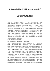 关于在市某局关于开展2023年“安全生产月”活动情况的报告根据《XXX省某局关于印发《2023年全省某系统“安全生产月”活动方案》的通知》(X〔2023〕X号)、《XX市人民政府安全生产委员会办公室XX市应急管理局关于印发2023年全市“安全生产月”活动方案的通知》(X〔2023〕X号)文件要求,我局高度重视,积极组织开展各项工作,并取得明显成效,安全责任充分落实,安全意识明显提高,现将我局活动开展情况报告如下:一、加强领导,周密部署,压实责任根据上级部门部署要求,我局制定下发了《XX市某局关于印发《2023年全市粮储系统”安全生产月”活动实施方案》的通知》(X〔2023〕X号),要求本系统各...