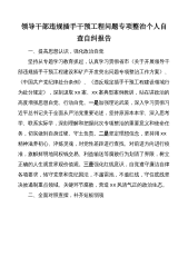 领导干部违规插手干预工程问题专项整治个人自查自纠报告一、提高思想认识,强化政治自觉坚持从专题学习教育抓起,认真学习贯彻省市《关于开展领导干部违规插手干预工程建设和矿产开发突出问题专项整治工作方案》、《中国共产党纪律处分条例》、《违反规定插手干预工程建设领域行为处分规定》,深刻汲取xx案、xx案典型案例教训,站在讲政治的高度增强思想自觉、行动自觉。一是加强理论武装,深入学习贯彻习近平总书记关于全面从严治党重要论述,坚持原原本本学、深入思考学、联系实际学,深刻理解和把握此次专项整治的重要意义和使命任务,切实做到自身过硬、守土负责。二是坚定理想信念,坚持用xx精神滋养初心、淬炼灵魂,对党性差距进行查...