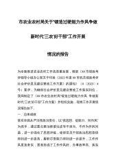 市农业农村局关于“锻造过硬能力作风争做新时代‘三农’好干部”工作开展情况的报告为全面推进农业农村工作高质量发展,根据《XX市绩效考评领导小组办公室关于印发《2022年度XX市机关绩效考评社会评价意见建议整改工作方案》的通知》(X〔2023〕X号)要求,为确保社会评价意见建议整改工作落实到位,我局制定了《XX市农业农村局“锻造过硬能力作风 争做新时代‘三农’好干部”工作方案》并组织实施,现将工作开展情况报告如下。一、总体成效落实全面从严治党政治责任,以“抓思想、提能力、转作风”为抓手,通过重点整治推诿扯皮等不担当、不作为作风问题,进一步强化了思想淬炼,使得党员干部政治思想觉悟得到进一步提高,履职...