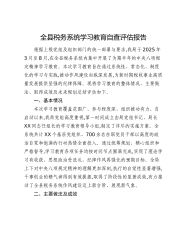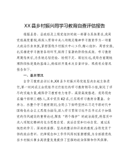 XX县乡村振兴局学习教育自查评估报告根据县委、县政府及上级党组织的统一部署与具体要求,我局党组高度重视,将深入贯彻中央八项规定精神学习教育作为一项重大政治任务来抓,紧密围绕乡村振兴中心工作,精心组织、周密安排,扎实推进学习教育各项环节,取得了显著的阶段性成效。学习教育周期结束后,为系统总结经验、检视不足、谋划长远,我局在前期梳理阶段性进展的基础上,特组织开展本次自查评估。现将有关情况报告如下。一、基本情况自学习教育启动以来,XX县乡村振兴局党组坚决扛起主体责任,第一时间成立由党组书记任组长的学习教育领导小组,制定了详尽的实施方案,确保学习教育有力有序、高质高效推进。我局现有在编干部职工65人,...