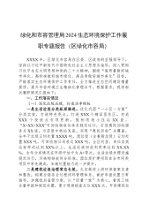 绿化和市容管理局2024生态环境保护工作履职专题报告(区绿化市容局)XXXX年,区绿化市容局在区委、区政府的坚强领导下,坚持以习近平新时代中国特色社会主义思想为指导,深入贯彻习近平生态文明思想和党的二十大精神,围绕“高质量做好城市净化、高标准做好城市绿化、高品质做好城市美化”目标,严格落实生态环境保护工作责任,全力推进生态空间建设增量提质,提升市容环境卫生精细化管理水平。根据要求,现将相关履职情况汇报如下:一、工作落实情况(一)深化垃圾治理,打造洁净模板一是生活垃圾分类纵深推进。优化巩固“一小区一方案”分类实效,打造特色亮点,打造XXX个精品居住区,完成XXX个投放点专项更新,提标改造小压站X...