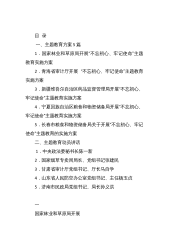 目录一、主题教育方案5篇1.国家林业和草原局开展“不忘初心、牢记使命”主题教育实施方案2.青海省审计厅开展“不忘初心、牢记使命”主题教育实施方案3.新疆维吾尔自治区药品监督管理局开展“不忘初心、牢记使命”主题教育实施方案4.宁夏回族自治区粮食和物资储备局开展“不忘初心、牢记使命”主题教育实施方案5.长春市粮食和物资储备局关于开展“不忘初心、牢记使命”主题教育的实施方案二、主题教育动员讲话1.中央政法委秘书长陈一新2.国家烟草专卖局局长、党组书记张建民3.甘肃省审计厅党组书记、厅长马自学4.山东省人民防空办公室党组书记、主任杨玉贞5.济南市民政局党组书记、局长孙义洪一国家林业和草原局开展“不忘初...