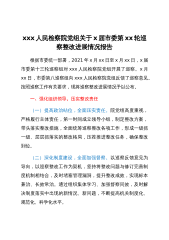 xxx人民检察院党组关于x届市委第xx轮巡察整改进展情况报告根据市委统一部署,2021年x月xx日至x月xx日,x届市委第十三轮巡察组对xxx人民检察院党组开展了巡察。x月xx日,市委第八巡察组向xxx人民检察院党组反馈了巡察意见。按照巡察工作有关要求,现将巡察整改进展情况予以公布。一、强化组织领导,压实整改责任(一)提高政治站位,全面压实责任。院党组高度重视,严格履行主体责任,第一时间成立领导小组,制定整改方案,带头落实整改措施,全面统筹巡察整改各项工作,形成一级抓一级、层层抓落实的整改格局,压茬推进整改任务,确保整改到位。(二)深化制度建设,全面加强督察。以巡察反馈意见为导向,以巡察整改工...
