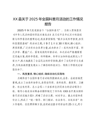 XX县关于2025年全国科普月活动的工作情况报告2025年9月是我国首个“全国科普月”。为深入贯彻落实《中华人民共和国科学技术普及法》及习近平总书记关于科技创新与科学普及的重要论述,我县紧密围绕“提升全民科学素质,夯实科技强国基础”的活动主题,于9月1日至30日期间,精心组织、周密部署,广泛动员社会各界力量,成功举办了一系列内容丰富、形式多样、覆盖广泛、富有成效的科普活动。本次活动严格遵循预定实施方案,将科学思想、科学精神、科学方法和科技成果送入千家万户,极大地激发了全县民众的科学热情,提升了全民科学文化素养,为我县高质量发展注入了强劲的科技动力。现将工作情况总结报告如下。一、高度重视,精心组...