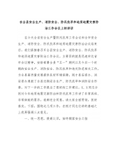 在全县安全生产、消防安全、防汛抗旱和地质地震灾害防治工作会议上的讲话在今天全省安全生产暨防汛抗旱工作会议和全市安全生产、消防安全、防汛抗旱和地质地震灾害防治会议结束后,我们紧接着召开全县安全生产、消防安全、防汛抗旱和地质地震灾害防治工作会议。主要目的就是迅速传达省市会议精神,安排部署全县“五一”期间以及今后一个时期的安全生产、消防安全、防汛抗旱和地灾防范相关工作,为全县高质量发展提供良好环境保障。刚才县安委办、消安委办通报了全县近期安全生产、防汛抗旱和消防安全形势,对下一步的工作提出了很好的工作建议。X、X同志分别对今年地质地震灾害防治和防汛抗旱工作讲了非常具体、非常细致的要求,我都完全同意,...