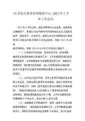 XX县机关事务管理服务中心2023年上半年工作总结2023年上半年以来,县机关事务中心在县委、县政府的正确领导下,坚持以习近平新时代中国特色社会主义思想为指导,真抓实干,主动作为,基层公务出行保障和办公用房管理工作获全市机关事务工作先进表彰;荣获2022年XX县级文明单位。现将2023年上半年工作总结汇报如下:(一)公务接待节俭高效。坚持务实节俭、杜绝浪费、确保安全的原则做好公务接待工作。上半年圆满完成应急管理部副部长、水利部副部长王道席防汛抗旱工作,省政协主席唐良智、省纪委书记刘海泉、省人大常委会副主任杨光荣、某市X区委书记刘健等考察调研的重要公务接待任务160余批次。(二)公车运行安全平稳...