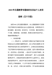 2023年专题民主生活会个人发言稿提纲(践行宗旨等6个方面+典型案例+意识形态)