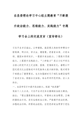在县委理论学习中心组主题教育“不断提升政治能力、思维能力、实践能力”专题学习会上的交流发言(宣传部长)习近平总书记指出,以学增智,就是要从党的科学理论中悟规律、明方向、学方法、增智慧,把看家本领、兴党本领、强国本领学到手。一要提升政治能力,二要提升思维能力,三要提升实践能力。“三种能力”是以习近平同志为核心的党中央立足世情、国情、党情新变化,着眼以中国式现代化全面推进中华民族伟大复兴新形势,既对领导干部提出了重要要求,也为加强新时代干部队伍建设指明了前进方向。根据会议安排,结合所学所思所悟,谈三点体会。一、在深学笃行中提升政治能力,练就“铁肩膀”党的十八大以来,习近平总书记多次强调政治能力建设...