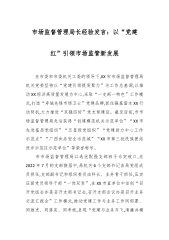 市场监督管理局长经验发言:以“党建红”引领市场监管新发展 在市委和市委机关工委的领导下,XX市市场监督管理局机关党委坚持以“党建引领提质聚力”为工作总基调,以推动XX经济高质量发展为中心,采取“一支部一特色”工作模式,打造“寿城先锋市场卫士”党建品牌,抓住强基固本XX行动契机,大力推进“双强四好”党支部建设。截至目前,市市场监督管理局先后获得“创建模范机关示范单位”“XX市先进基层党组织”“五星级党组织”“党建助力中心工作示范点”“广西食品安全示范城”“XX市第三批民族团结进步示范区示范单位”等荣誉称号。 市市场监督管理局以选优配强支部班子为突破口,在2022年7月的支部换届中,局机关6个...