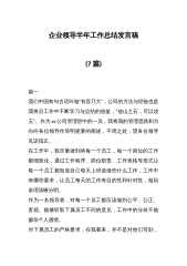 企业领导半年工作总结发言稿(7篇)篇一我们中国有句古话叫做“有容乃大”,公司的方法与经验也是我将后工作中不断学习与总结的借鉴,“他山之石,可以攻玉”。作为xx公司管理层中的一员,我将我的管理思路和方向向各位领导作简明扼要的阐述,不周之处,望各位领导见谅指正。在工作中,我尽量做到将每一个员工,每一个岗位的工作都细致化,通过工作程序、岗位职责、工作表格等形式让每一个员工都知道自己每天上班该做些什么工作,工作中有哪些要求,让员工每天的工作有目的性和针对性,做到条理清晰分明。作为一名领导者,对每一个员工都应该做到公平、公正、客观。能够听取下属员工不同的意见,工作中的分歧不能掺杂个人感情。对下属员工的严...