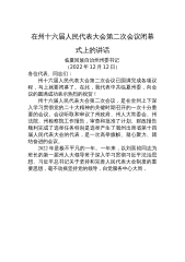 在州十六届人民代表大会第二次会议闭幕式上的讲话临夏回族自治州州委书记(2022年12月12日)各位代表、同志们:州十六届人民代表大会第二次会议已圆满完成各项议程,马上就要闭幕了。在此,我代表中共临夏州委,向会议的圆满成功表示热烈的祝贺!州十六届人民代表大会第二次会议,是在全州上下深入学习贯彻党的二十大精神的关键时期召开的一次十分重要的会议。会议听取和审议了州政府、州人大常委会、州法院、州检察院工作报告,审查和批准了计划、财政报告顺利完成了选举任务特别是选举产生了我州出席省第十四届人民代表大会的代表,是一次高举旗帜、凝心聚力、团结奋进的会议。2022年是极不平凡的一年。一年来,以刘富祯同志为班长...