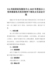 XX州政府政务服务中心2025年度县以上党和国家机关党员领导干部民主生活会方案根据《中共XX 州纪委XX 州委组织部关于开好XX 州2025年度县以上党和国家机关党员领导干部民主生活会的通知》(X〔2025〕X号)要求,结合我中心实际,制定如下方案。一、会议主题深入学习贯彻习近平新时代中国特色社会主义思想,全面贯彻落实党的二十届四中全会精神,以打攻坚战、持久战的决心和恒心,锲而不舍落实中央八项规定精神,推进作风建设常态化长效化,以优良作风凝心聚力、真抓实干,全力推进民族地区高质量发展XX 典范建设。二、会议安排(一)会议时间拟定于2026 年2月州委民主生活会后召开(具体时间待请示州督导组后另...