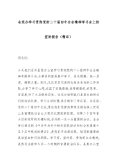 在党办学习贯彻党的二十届四中全会精神学习会上的宣讲报告(精品)同志们:今天我们召开县委办公室学习贯彻党的二十届四中全会精神专题学习会,主要目的就是集中学习、深化理解、统一思想、凝聚力量。刚才,几位党员代表同志结合各自的工作实际,分享了学习心得,交流了实践感悟,讲得都很好,有思考、有深度,听了之后很受启发。这充分说明我们县委办的同志们政治站位高、学习主动性强,真正做到了学在前、走在前。党的二十届四中全会,是在我们党团结带领全国各族人民迈上全面建设社会主义现代化国家新征程、向第二个百年奋斗目标进军的关键时刻,召开的一次十分重要的会议。全会审议通过的《中共中央关于制定国民经济和社会发展第十五个五年规...