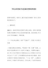 XX街道XX社区党支部书记2025年度述职报告(精品)各位领导、同志们:2025年是实施“十四五”规划的收官之年,也是承上启下、谋划“十五五”发展的关键一年。一年来,在XX街道党工委的坚强领导和悉心指导下,本人认真履行社区党支部书记、居委会主任“一肩挑”职责,牢记“第一责任人”使命,坚持以习近平新时代中国特色社会主义思想为指导,深入学习贯彻党的二十大和二十届二中、三中、四中全会精神,紧密团结和带领支部班子成员及全体党员,聚焦社区发展核心任务,锐意进取、真抓实干,全力推动党建工作与社区治理、民生服务深度融合,各项工作取得了新的进展和成效。现将2025年度个人履职情况报告如下。一、履职尽责情况(一...