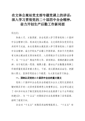 在文体公寓站党支部专题党课上的讲话:深入学习贯彻党的二十届四中全会精神,奋力开创生产后勤工作新局面同志们:阳春三月,万象更新。在全党深入学习贯彻党的二十届四中全会精神之际,我来到文体公寓站,与支部的各位党员同志共同学习交流。本次党课的主题是深入学习贯彻党的二十届四中全会精神,奋力开创生产后勤工作新局面。参加今天党课的有文体公寓站党支部全体党员、入党积极分子以及部分业务骨干。在“十五五”规划开局之年,深刻领会、准确把握全会精神,对于我们统一思想、凝聚力量,推动生产后勤服务保障工作高质量发展具有重大意义。下面,我从提高政治站位、把握核心要义、坚持学用结合三个维度,与大家交流学习体会。一、深刻认识党...