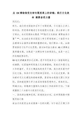 在XX博物馆党支部专题党课上的讲稿:践行文化使命凝聚奋进力量同志们:昨天,我们党支部组织召开了专题党课,今天我以主讲人的身份,将党课讲稿进行系统梳理与完善,供大家深入学习领会。本次党课的主题是**“践行文化使命凝聚奋进力量”**。在当前全党全国深入学习贯彻党的二十届四中全会精神与全国两会精神的重要时刻,我们聚在一起,全面贯彻落实习近平文化思想,探讨如何奋力推动XX文博事业高质量发展,这既是一次理论学习的再深化,也是一次工作实践的再动员。XX地处青藏高原东北边缘,是中华民族多元一体格局的生动缩影,这里独特的民族文化资源禀赋,是我们开展文化工作的富矿。作为文博战线的党员干部,我们肩负着守护历史文脉...