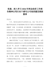 党课:深入学习2026年两会政府工作报告精神以笃行实干谱写公司高质量发展新篇章同志们:今天,我们在这里召开支部党员大会,我以“深入学习 2026年两会政府工作报告精神以笃行实干谱写公司高质量发展新篇章”为题,为大家讲授一堂专题党课。目的就是要在第一时间传达学习、深刻领会、全面贯彻今年全国两会的精神,特别是政府工作报告中蕴含的重大判断、战略部署和实践要求,切实把我们全体党员的思想和行动统一到党中央的决策部署上来,统一到推动公司实现更高质量发展的具体实践中来。2026年是实施“十五五”规划承上启下的关键之年,也是我们国家在全面建设社会主义现代化国家新征程上具有里程碑意义的一年。在这样一个关键节点召...