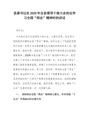 县委书记在2026年全县领导干部大会传达学习全国“两会”精神时的讲话同志们:今天我们召开全县领导干部大会,主要任务是,传达学习刚刚胜利闭幕的全国“两会”精神,动员全县上下迅速把思想和行动统一到党中央决策部署和大会确定的目标任务上来,凝聚共识、抢抓开局、真抓实干,奋力谱写中国式现代化县域实践新篇章。2026年是实施“十五五”规划的开局之年,是迈向第二个百年奋斗目标新征程的关键一年。这次全国“两会”,擘画了国家发展新蓝图,明确了今年经济社会发展的总体要求、政策取向和重点任务。学习好、宣传好、贯彻好全国“两会”精神,是当前和今后一个时期全县上下的重要政治任务。全县各级党组织和广大党员干部要切实提高政...