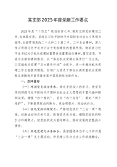 某支部2025年度党建工作要点2025年是“十四五”规划收官之年,做好支部党的建设工作,总体要求是。坚持以习近平新时代中国特色社会主义思想为指导,全面贯彻党的二十大和二十届二中、三中全会精神,深入学习贯彻习近平总书记关于党的建设的重要思想,特别是习近平总书记关于机关党建的重要讲话重要指示精神,锚定省委、市委全会新部署新要求,以“落实机关党建主体责任”为主线,以实施机关党建“五大提升行动”为抓手,进一步推动机关党建工作全面提质增效,引领广大党员干部在以高质量机关党建服务保障我市高质量发展中展现新担当新作为。一、总体目标(一)增强党员政治素养。通过系统深入的学习,使党员深刻领悟习近平新时代中国特色...