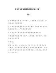 党纪学习教育专题党课讲稿汇编(3篇)目录1.学党纪筑牢规矩“防火墙”,心存敬畏,使守纪律、讲规矩成为行动自觉22.从讲政治的高度抓实党纪学习教育,不断提高政治站位、扛起政治责任、严守政治底线133.从《条例》修订看如何全面加强纪律建设24学党纪筑牢规矩“防火墙”,心存敬畏,使守纪律、讲规矩成为行动自觉同志们,经党中央同意,自2024年4月至7月在全党开展党纪学习教育。这次党纪学习教育,是加强党的纪律建设、推动全面从严治党向纵深发展的重要举措。心有所戒,行有所止。作为党员干部,不管在什么岗位,都应当把纪律挺在前面,时刻绷紧纪律之弦、筑牢作风之堤,在讲规矩中干好事、在守纪律中干成事,把遵守党的政治...