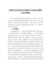 市委书记在党纪学习教育关于群众纪律研讨发言材料近日,按照省委和市委安排部署,深入学习了习近平总书记关于党的建设的重要论述精神,逐字逐句再次学习了新修订的《中国共产党纪律处分条例》,下面,结合工作实际和自身存在的一些问题,我就围绕“群众纪律”这一主题作如下研讨交流发言。一、认识体会党章明确规定:“党在任何时候都把群众利益放在第一位,同群众同甘共苦,保持最密切的联系。”中国共产党的百年发展历史表明,党来自于人民群众,植根于人民群众,人民群众是党不断发展壮大的力量源泉,正是依靠人民群众的支持,党才领导人民群众取得胜利,成为民心所向的执政党。党的群众纪律是党的各级组织和全体党员在贯彻执行党的群众路线和...