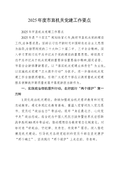 2025年度市直机关党建工作要点2025年市直机关党建工作要点2025年是“十四五”规划收官之年,做好市直机关党的建设工作,总体要求是:坚持以习近平新时代中国特色社会主义思想为指导,全面贯彻党的二十大和二十届二中、三中全会精神,深入学习贯彻习近平总书记关于党的建设的重要思想,特别是习近平总书记关于机关党建的重要讲话重要指示精神,锚定省委、市委全会新部署新要求,以“落实机关党建主体责任”为主线,以实施机关党建“五大提升行动”为抓手,进一步推动机关党建工作全面提质增效,引领广大党员干部在以高质量机关党建服务保障我市高质量发展中展现新担当新作为。一、实施政治领航提升行动,走好践行“两个维护”第一方阵...