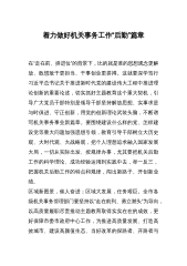 中心组发言:高质量的组织工作保障推动事业高质量发展习近平总书记对党的建设和组织工作作出重要指示,为做好新时代组织工作提供了根本遵循。县委组织部将深入学习贯彻习近平总书记关于党的建设重要思想,全面落实全国、全省组织工作会议精神,精准谋划、主动作为,稳步推进各项重点工作,为加快推进安仁高质量发展提供坚强保证。凝聚政治自觉、行动自觉的奋进力量。坚持不懈用习近平新时代中国特色社会主义思想凝心铸魂,持续强化政治引领,聚焦夯实思想根基。强化政治建设。常态化开展政治忠诚教育,在干部教育培训、干部监督管理、考核考察谈心谈话等工作中突出旗帜鲜明讲政治的要求,教育引导各级党组织和广大党员深刻领悟“两个确立”的决定...