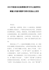 2023年度县长在县委理论学习中心组防范化解重大风险专题学习研讨交流会上发言同志们:备豫不虞,为国常道。党的二十大报告提出,要提高防范化解重大风险能力,严密防范系统性安全风险。县域是国家治理的基石,县域安,则国家安。防范化解重大风险如何在县域落地落细,我认为就是要带头坚持底线思维、系统思维、闭环思维,清醒识风险、主动防风险、有效化风险,切实打好防范化解风险阻击仗,以**一域之稳维护全国大局之安。要时时放心不下,以底线思维清醒认识风险。县一级是防范化解重大风险的前沿阵地,必须树牢底线思维,强化风险意识,以"四观"清醒认识风险,做到心中有数、了然于胸。要看透“灰黑观”。"灰"即"灰犀牛",指大概率...