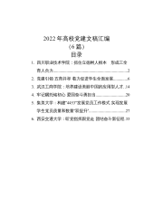 2022年高校党建文稿汇编(6篇)目录1.四川职业技术学院:抓住立德树人根本 形成三全育人合力........................................................................22.党建引领五育并举着力促进学生全面发展..............63.武汉工商学院:培养建设美丽中国的应用型人才..144.牢记嘱托铭初心爱国奋斗勇担当.............................205.集美大学:构建“4453”发展党员工作模式实现发展学生党员质量和数量“双提升”.................................