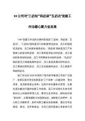 Xx公司党建工作经验交流材料:用好本土红色资源助力销售提质增效 近年来,分公司党委充分挖掘红色资源、加强红色传承,结合改革发展的具体场景,积极探索将红色传统和红色基因融入基层党建工作的有效途径,将党建工作的“软实力”转化为企业发展的“硬支撑”,推动实现以高质量党建引领保障企业高质量发展。 一、主要做法 一是强化“红色理念”,推进主体责任落实。分公司各党支部均建立由党支部书记负总责,组织委员直接抓、支部党员协同抓的工作格局,形成上下联动、齐抓共管的组织体系,牢固树立“抓好党建是本职,不抓党建是失职,抓不好党建是渎职”理念,形成“党建工作做实了就是生产力、做强了就是竞争力,做细了就是凝聚力”...