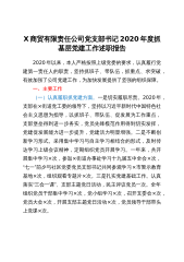 X商贸有限责任公司党支部书记2020年度抓基层党建工作述职报告2020年以来,本人严格按照上级党委的要求,认真履行党建第一责任人的职责,坚持抓班子、带队伍,抓重点、求突破,有效加强了公司党建工作,为加快发展提供了坚强的组织保障。一、主要工作(一)认真履职抓党建方面。一是切实履职尽责。2020年,支部在×街道党工委的领导下,坚持以习近平新时代中国特色社会主义思想为指导,以抓班子、带队伍、促发展为工作重点,支部堡垒得到进一步务实,党员先锋模范作用得到切实发挥,党建促发展能力进一步提升,党建活力明显增强。二是不断创新学习形式。采用集中学习与自主学习相结合的形式,及时传达学习上级会议精神,定期组织党员...
