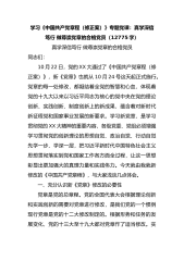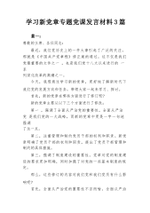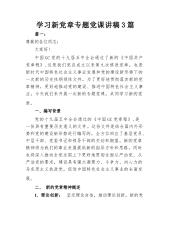 学习新党章专题党课讲稿3篇篇一:尊敬的各位同志:大家好!中国GC党的十九届五中全会通过了新的《中国共产党章程》,这是我们党自成立以来第九次修改党章,也是新时代中国特色社会主义事业发展和党的建设新形势下的一次新的历史性纲领性文件。为了更好地贯彻落实新的党章精神,更好地推动党的建设、推进中国特色社会主义事业,今天我们来开展一次新的专题党课,共同学习新的党章。一、编写背景党的十九届五中全会通过的《中国GC党章程》,是一份具有重要历史意义的文件。这份文件是结合国内外形势和党的建设新形势进行编写的,全方位回应了基层党员、中层干部、党委书记和领导干部的关切和期望。新的党章精神将为我们的事业发展提供新的指导...