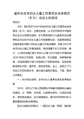 副市长在市妇女儿童工作委员会全体委员(扩大)会议上的讲话同志们:今天,我们召开2020年全市妇女儿童工作委员会全体委员(扩大)会议,主要任务是:以习近平新时代中国特色社会主义思想为指导,学习贯彻党的十九届四中全会精神和总书记关于妇女儿童工作的重要论述,全面贯彻落实全国全省全市第六次妇女儿童工作会议精神,听取2019年全市妇女儿童工作情况报告,研究部署下步工作任务。刚才,xx同志全面汇报了市妇儿工委2019年的工作情况和2020年的工作安排,市统计局、市卫健委、市教育体育局、市民政局四个部门分别进行了很好的发言,这些发言都很有针对性、操作性,我完全同意。会上,还签订了今年的工作目标责任书,请大家...