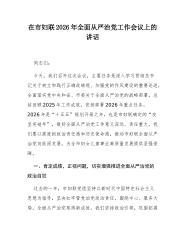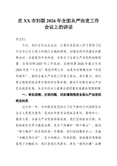 在XX市妇联2026年全面从严治党工作会议上的讲话同志们:今天,我们召开这次会议,主要任务是深入学习贯彻习近平总书记关于树立和践行正确政绩观、加强党的作风建设的重要论述,全面落实中央和省、市委关于全面从严治党的战略部署,总结回顾2025 年工作成效,安排部署2026 年重点任务2026年是“十五五”规划开局之年,也是市妇联确定的“攻坚突破年”,做好全面从严治党工作意义深远、责任重大。我们要以高度的政治责任感和历史使命感,推动市妇联全面从严治党向纵深发展,为全市妇女儿童事业高质量发展提供坚强保障。一、肯定成绩,正视问题,切实增强推进全面从严治党的政治自觉过去的一年,市妇联党组坚持以习近平新时代中...