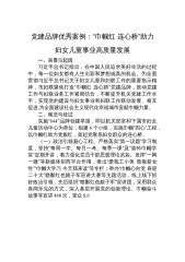 党建品牌优秀案例:“巾帼红连心桥”助力妇女儿童事业高质量发展一、背景与起因习近平总书记指出,在中国人民追求美好生活的过程中,每一位妇女都有人生出彩和梦想成真的机会。为全面贯彻习近平总书记关于妇女儿童和妇联工作的重要指示精神,市妇联聚焦打造“巾帼红连心桥”党建品牌,推动党建工作与妇联业务工作紧密结合,不断提升机关党建工作水平,实现党的建设与妇女事业和妇联工作联动发展、相互促进,为全面建设社会主义现代化幸福城市贡献巾帼力量。二、做法与经过实施“644”品牌创建举措,即以机关部室和下属市妇女儿童活动中心为单位,组建6个小组,实施巾帼“四心”工程,以巾帼红助力党旗红,架起党联系妇女群众的连心桥。(一)...