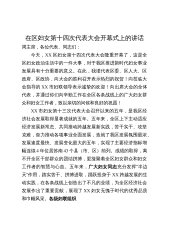 在区妇女第十四次代表大会开幕式上的讲话周主席,各位代表、同志们:今天,XX区妇女第十四次代表大会隆重开幕了,这是全区妇女政治生活中的一件大事,对于我区推进新时代妇女事业发展具有十分重要的意义。在此,我谨代表区委、区人大、区政府、区政协,向大会的胜利召开表示热烈的祝贺!向莅临大会指导的XX市妇联领导表示诚挚的欢迎!向出席大会的全体代表,并通过你们向辛勤工作在全区各条战线上的广大妇女群众和妇女工作者,致以亲切的问候和良好的祝愿!XX市妇女第十三次代表大会召开以来的五年,是我区经济社会发展取得显著成就的五年。五年来,全区上下主动适应经济发展新常态、共同推动跨越发展新实践,苦干实干、攻坚克难,奋力推动...