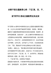 妇联干部主题教育心得:下足“真、实、干、效”四字功推动主题教育走实走深学习贯彻xxx新时代中国特色社会主义思想主题教育开展以来,儿少中心党支部严格按照“学思想、强党性、重实践、建新功”主题教育的要求组织全体党员读原著、悟原理,坚持学思用贯通,知信行统一,把xxx新时代中国特色社会主义思想转化为坚定理想,锤炼党性和指导实践,真正将其内化于心,外化于行,自觉地用来指导工作,在以学铸魂以学增智、以学正风、以学促干上下功夫,扎实推进各项工作。下面,我就在学习中的点滴体会与大家汇报交流。“欲事立,须是心立。”我们要在常学常新中提升理论修养,在学思践悟中牢记初心使命,在知行合一中主动担当作为,在学习与工作...