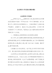 企业财务工作总结合集(5篇)企业财务工作总结____即将过去与____就要到来之际,我先祝贺各位同事在度过愉快丰收的一年和在未来一年中万事顺意!自己在局与中心领导和全体同事的关心、支持和帮助下,坚持自我严格要求、加强学习、踏实工作,在政治思想、工作学习等方面取得了不小的进步,下面把自己各方面的表现向领导和同事们作个小总结。一、爱岗敬业,坚持原则树立良好的职业道德在工作中,自己按照发展要有新思路,改革要有新突破,开放要有新局面,各项工作要新举措的要求,在工作中要能够坚持原则,秉公办事,顾全大局,以新《会计法》为依据。遵纪守法,遵守财经纪律。认真履行会计岗位职责,一丝不苟,忠于职守尽职尽责的工作。...