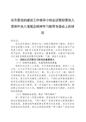在市委党的建设工作领导小组会议暨部署深入贯彻中央八项规定精神学习教育专题会上的讲话同志们:在全党开展深入贯彻中央八项规定精神学习教育,是党中央作出的重大决策,对于巩固作风建设成果、推进全面从严治党意义深远。XX作为改革开放前沿阵地,必须以更高站位、更严标准、更实举措,落实好这一重要部署,为推进中国式现代化XX实践提供坚强作风保障。下面,我讲几点意见。一、深刻认识开展学习教育的重要意义(一)加强作风建设,巩固党的执政根基党的作风关系人心向背,关乎党的执政基础。党的十八大以来,以习近平同志为核心的党中央从制定和落实中央八项规定开局破题,党风政风为之一新,党心民心为之一振。XX作为党的诞生地,更应传...