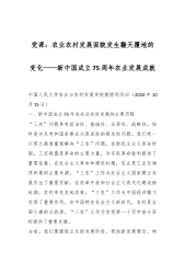 党课:农业农村发展面貌发生翻天覆地的变化——新中国成立75周年农业发展成就中国人民大学农业与农村发展学院教授郑风田(2024年10月15日)一、新中国成立75年来农业农村发展的主要历程“三农”问题具有政治性、基础性、全局性、战略性,始终是关系党和国家事业兴衰成败的根本性问题。我们党一以贯之高度重视解决“三农”问题,在新民主主义革命时期,工农联盟是革命的主要力量,为夺取革命胜利提供了重要依靠。在社会主义革命和建设时期,农业是工业化物质积累的主要来源,“三农”工作为社会主义国家建立发展作出了重要贡献。在改革开放和社会主义现代化建设新时期,农村率先发起改革,“三农”工作为中国经济腾飞发挥了重要作用。...