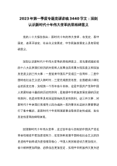 2023年第一季度专题党课讲稿3440字文:深刻认识新时代十年伟大变革的里程碑意义党的二十大报告指出:新时代十年的伟大变革,在党史、新中国史、改革开放史、社会主义发展史、中华民族发展史上具有里程碑意义。深刻认识新时代十年伟大变革的里程碑意义,首先要把握好党的十八大以来我们经历的对党和人民事业具有重大现实意义和深远历史意义的三件大事:一是迎来中国共产党成立一百周年,二是中国特色社会主义进入新时代,三是完成脱贫攻坚、全面建成小康社会的历史任务,实现第一个百年奋斗目标。这是中国共产党和中国人民团结奋斗赢得的历史性胜利,是彪炳中华民族发展史册的历史性胜利,也是对世界具有深远影响的历史性胜利。这三件大事...