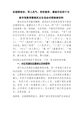 在理想信念、用人风气、党性修养、遵规守纪四个方面专项教育整顿民主生活会对照检查材料通过参加专项教育整顿,我深刻认识到党员领导干部首先要修好身,着重在五个字上下功夫,即“忠”(对党绝对忠诚是唯一的、彻底的、无条件的、不掺任何杂质的、没有任何水分的,绝不能假忠诚、伪忠诚、亚忠诚)、“信”(坚定对马克思主义的信仰、共产主义的信念、改革开放的信心、党的领导的信赖)、“义”(讲大义、有正义)、“气”(具有革命气节)、"廉”(清正廉洁);其次要为好官,做到“深思"(三思而行)、"广闻”(广纳兼听)、“本公”(克己奉公)、"慎权”(谨慎用权)、“垂范”(以身作则);第三要干好事,做到找准定位、吃苦耐劳、敢于...
