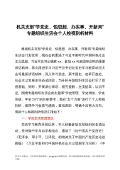 机关支部“学党史、悟思想、办实事、开新局”专题组织生活会个人检视剖析材料根据机关支部“学党史、悟思想、办实事、开新局”专题组织生活会计划安排,我在会前重温了习近平新时代中国特色社会主义思想、习近平总书记视察xx、参加xx代表团审议时的重要讲话精神,再次跟进学习习近平总书记在党史学习教育动员大会等最新讲话精神,深入学习党史、新中国史、改革开放史、社会主义发展史等必读内容,为开好专题组织生活会打牢了思想基础。同时,开展谈心谈话,相互提醒,交流提高,认识不足。围绕专题组织生活会的主题和“学史明理、学史增信、学史崇德、学史力行”的目标要求,我在“五个方面”进行了个人检视剖析,梳理学习收获与感悟,查找差...