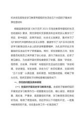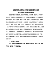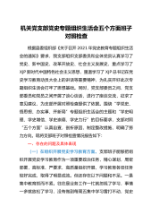 机关党支部党史学习教育专题组织生活会五个方面班子集体对照检查材料根据县委组织部《关于召开2021年党史教育专题组织生活会的通知》要求,我支部组织支部委员和全体党员认真学习了党史、新中国史、改革开放史、社会主义发展史,重点学习了XJP新时代中国特色社会主义思想,重温学习了XJP总书记在党史学习教育动员大会上的讲话等重要精神,为扎实开好此次专题组织生活会打牢了思想基础。同时,党支部委员之间、党支部委员和党员之间开展了谈心谈话,进行了座谈交流,征求了意见建议,为支部开展对照检查提供了依据。围绕“学党史、悟思想、办实事、开新局”专题组织生活会的主题和“学史明理、学史增信、学史崇德、学史力行”的目标要求...