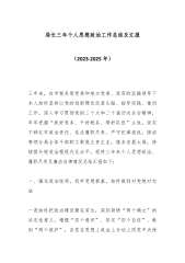 局长三年个人思想政治工作总结及汇报(2023-2025年)三年来,在市税务局党委和地方党委、政府的坚强领导下本人始终坚持以党的创新理论武装头脑、指导实践、推动工作,深入学习贯彻党的二十大和二十届历次全会精神,牢牢把握“抓好党务、干好税务、带好队伍”主线,坚定不移扛牢政治责任、依法履职尽责、严守纪律底线,团结带领分局全体干部职工聚焦主责主业,服务发展大局,持续提升税收治理现代化水平。现将三年来个人思想政治、履职尽责及廉洁自律情况总结汇报如下:一、强化政治统领,筑牢思想根基,始终做到对党绝对忠诚一是始终把政治建设摆在首位,深刻领悟“两个确立”的决定性意义,增强“四个意识”、坚定“四个自信”、做到“...