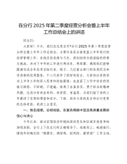 在分行2025年第二季度经营分析会暨上半年工作总结会上的讲话同志们:大家好!今天,我们在这里召开*分行2025年第二季度经营分析会暨上半年工作总结会,主要任务是全面复盘上半年我行的经营管理工作,系统总结成绩与不足,深刻剖析当前面临的形势与挑战,并对下半年的工作进行再动员、再部署,确保我们能够圆满完成全年各项目标任务。刚才,几位前台部门的负责同志和受表彰的优秀集体、个人代表作了很好的发言。大家的分享既有对上半年工作的深入思考和经验提炼,也直面了工作中存在的短板与困惑,不回避、不遮掩,体现了求真务实、勇于担当的精神风貌。这些分享有血有肉,有深度、有温度,为我们接下来的工作提供了宝贵的借鉴和启示。下...
