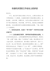 在县机关党的工作会议上的讲话同志们:今天,我们召开县机关党的工作会议,主要任务是深入学习贯彻党的二十大精神,全面落实新时代党的建设总要求,总结成绩、分析形势、部署任务,动员全县机关党组织和广大党员干部以更高标准、更实举措、更严作风,推动机关党建高质量发展,为加快建设现代化新提供坚强政治保障。下面,我讲三个方面意见。一、坚持政治统领,在践行“两个维护”中把牢机关党建正确方向(一)以政治建设为根本,铸牢绝对忠诚的政治品格。机关首先是政治机关,必须把旗帜鲜明讲政治贯穿始终。要深化“第一议题”制度,健全“五学联动”机制,通过理论学习中心组示范学、党支部常态学、青年理论小组研讨学、党员个人自主学、线上线...