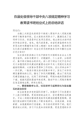 在县处级领导干部中央八项规定精神学习教育读书班结业式上的总结讲话同志们:为期三天的县处级领导干部深入贯彻中央八项规定精神学习教育读书班,在大家的共同努力下,圆满完成了各项学习任务。受县委书记X同志委托,我主持这次读书班并作结业讲话。首先,我代表县委,向省纪委监委有关负责同志的专题辅导表示衷心感谢!向参与组织、服务的同志们表示诚挚慰问!向各位学员的积极参与和辛勤付出表示充分肯定!这次读书班坚持以习近平新时代中国特色社会主义思想为指导,采取专题学习、专题辅导、个人自学、分组研讨、集中研讨相结合的形式,深入学习领会习近平总书记关于加强党的作风建设的重要论述和中央八项规定及其实施细则精神。大家紧扣思想...