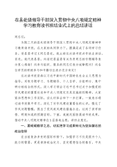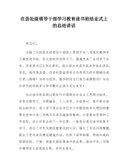在县处级领导干部深入贯彻中央八项规定精神学习教育读书班结业式上的总结讲话同志们:为期三天的县处级领导干部深入贯彻中央八项规定精神学习教育读书班,在大家的共同努力下,圆满完成了各项学习任务。受县委书记X同志委托,我主持这次读书班并作结业讲话。首先,我代表县委,向省纪委监委有关负责同志的专题辅导表示衷心感谢!向参与组织、服务的同志们表示诚挚慰问!向各位学员的积极参与和辛勤付出表示充分肯定!这次读书班坚持以习近平新时代中国特色社会主义思想为指导,采取专题学习、专题辅导、个人自学、分组研讨、集中研讨相结合的形式,深入学习领会习近平总书记关于加强党的作风建设的重要论述和中央八项规定及其实施细则精神。大家...