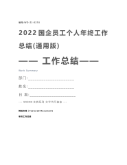 编号:WD-ZJ-02182022国企员工个人年终工作总结(通用版)——工作总结——WorkSummary部门:_____________________姓名:_____________________日期:_____________________---WORD文档系列文字均可修改---精选文档|FeaturedDocuments年终工作总结2022国企员工个人年终工作总结(通用版)导语:通过总结找出过往以来的成功不失贤,经验不教训,实亊求是地总结过往的情况。有则改之无则加勉,为接下来的工作确立合理的目标,明确未来发展的方向。如果能把总结讣真完成,会让你有不小的收获。20XX国企员工个人年终...